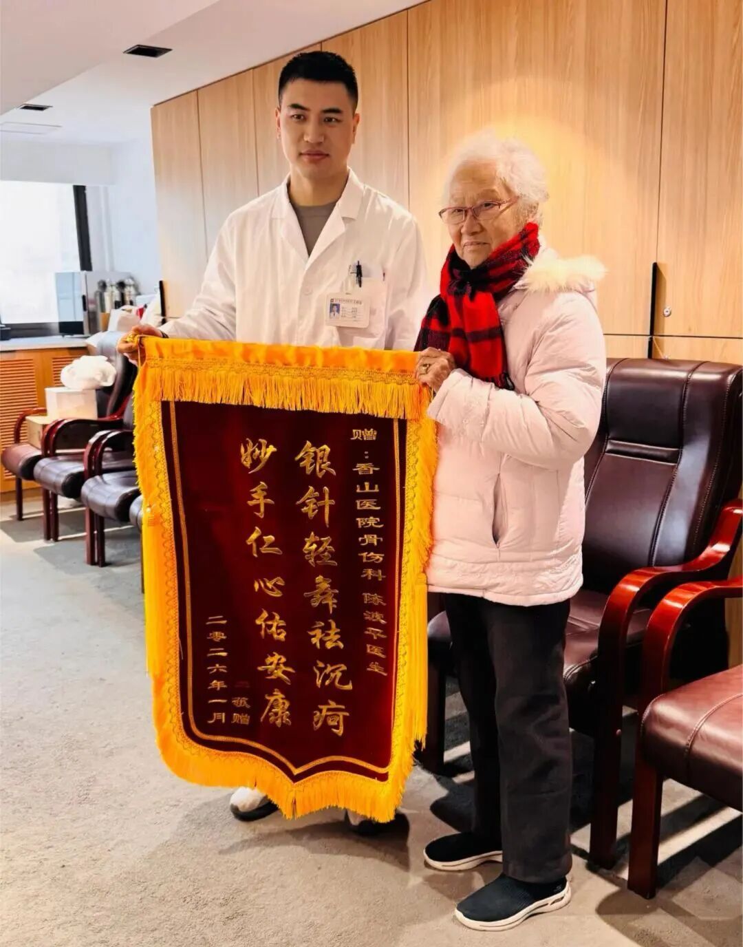 蒋阿姨此前深受多年腰腿疼痛困扰,近期疼痛加剧,严重影响了她的日常活动。在家人焦急万分之际,她来到香山中医医院施氏伤科寻求帮助。陈波平医师团队根据蒋阿姨的病情,为她制定了个性化的中医综合保守治疗方案,运用施氏伤科特色针灸、专属膏药外敷以及理筋推拿等多种疗法进行系统治疗。经过一段时间的精心治疗,蒋阿姨的症状得到了显著缓解,活动能力明显改善,最终顺利康复出院。为了表达对陈波平医师及施氏伤科团队的感激,蒋阿姨特意定制了这面锦旗。