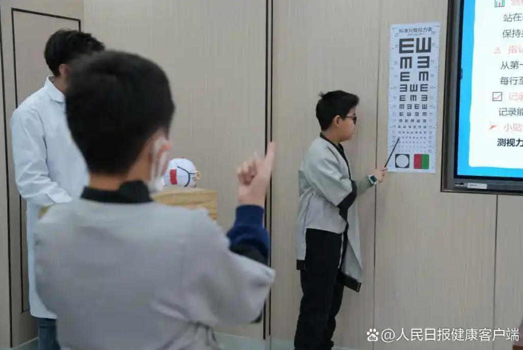 在医务人员指导下,小朋友们体验互相检测视力。石梦竹 摄