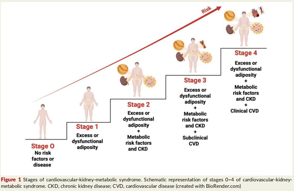 声明指出,代谢紊乱引发心血管风险的机制具有多因素、复杂性和高度关联性的特点,低度炎症、氧化应激、内皮功能障碍、胰岛素抵抗以及脂质和能量代谢紊乱等分子异常并非仅存在于心肌,而是以全身过程发挥作用,肝脏、脂肪组织、肾脏和心脏之间通过细胞因子、脂肪因子、肝因子等分泌介质进行双向通讯,共同升高心血管疾病风险和进展,这些相互作用的复杂性体现在心血管-肾脏-代谢综合征这一新提出的框架中,该框架涵盖了肥胖、2 型糖尿病、血脂异常、心血管疾病和慢性肾病(CKD)之间的交集。