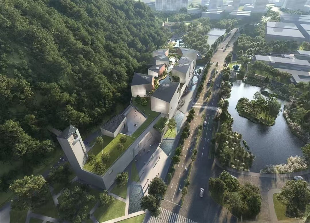 记者走访看到,该博物馆楼顶景观处,建筑盒子、景观鱼池、舞台等已显雏形,与山体绿意交融相生。在场馆内部,亦可透过窗户及屋顶玻璃,与周边的自然山体、天空相互呼应。陈秋娟介绍,该博物馆拥有得天独厚的自然山体景观,设计团队在建筑设计中充分考量了这一地域特点,“在馆内参观时,观众可以在室内尽览山景,形成与自然对话的独特参观体验。”
