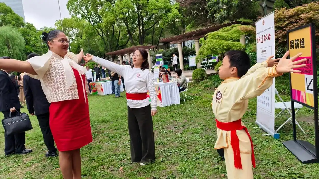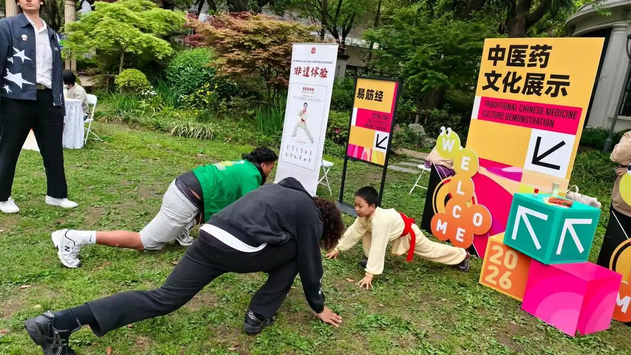在活动的中医药文化易筋经导引法体验区,国家级非物质文化遗产代表性项目“中医诊疗法(古本易筋经十二势导引法)”第六代传承人严正和引导美国青年了解中医技法,感受中华优秀传统文化的独特魅力。