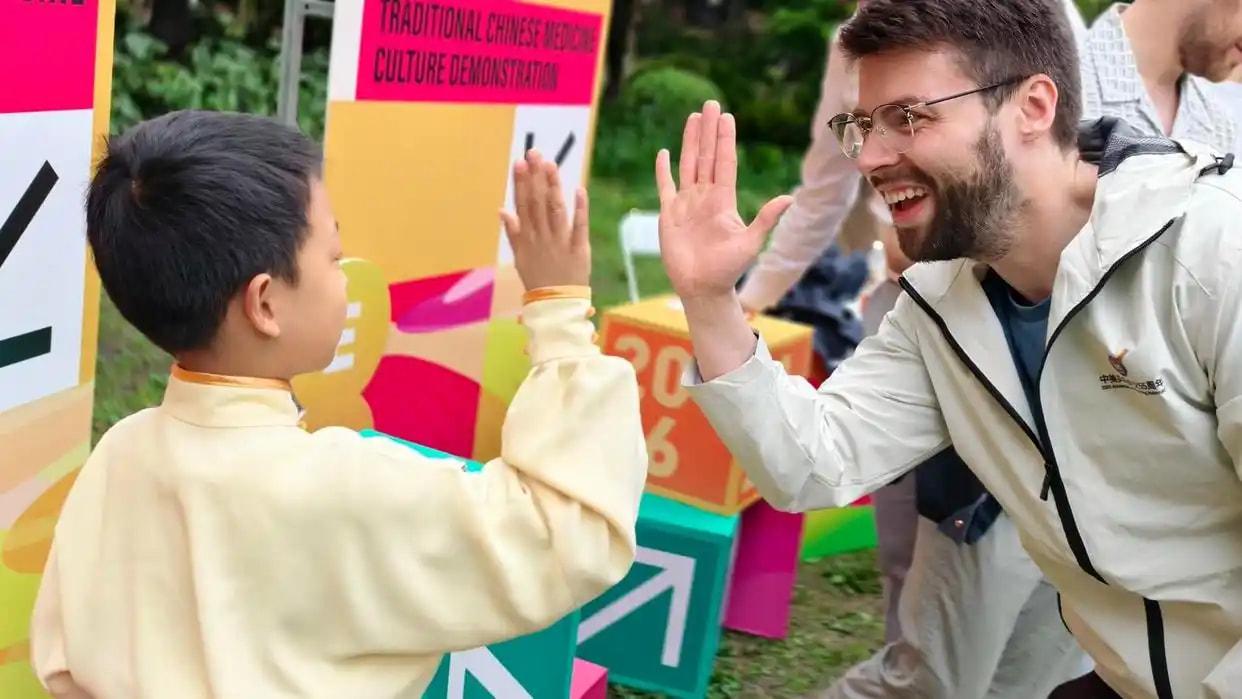 严正和就读于上海福山花园外国语小学二年级,自幼跟随爷爷、父亲和哥哥学习中医导引术。作为中医诊疗法的重要组成部分,中医导引术对运动员的肢体舒展和疲劳恢复具有独特作用。现场,中美学生和运动员跟随“小小传承人”学习导引动作,在亲身体验中理解中医导引术,品味中医文化。