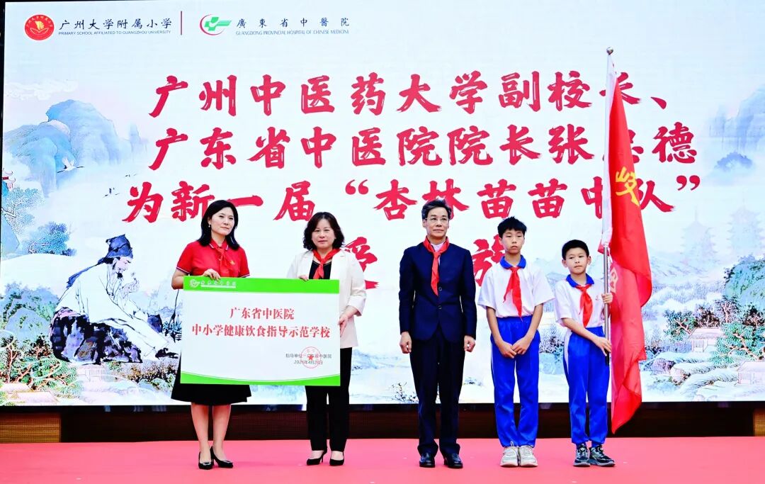 仪式传承环节,张忠德为新一届“杏林苗苗中队”授旗,史俏蓉向学校授予“广东省中医院中小学健康饮食指导示范学校”。将中医药文化传承的使命交付给少年学子,鼓励孩子们主动学习中医药知识、传承中医药文化,争当中医药文化的小小传播者与践行者,让岐黄薪火在青少年心中生根发芽。