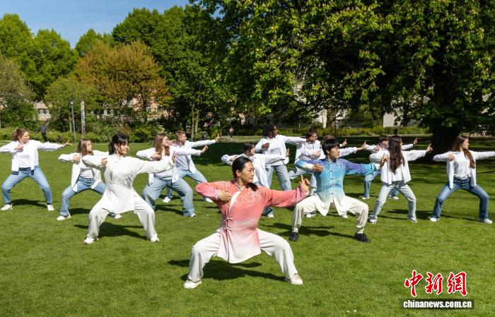 当地时间4月24日,北京中医药大学国家一级武士胡雁宾副教授在埃森音乐厅花园带伯乐中文合唱团团员做八段锦。王东 摄