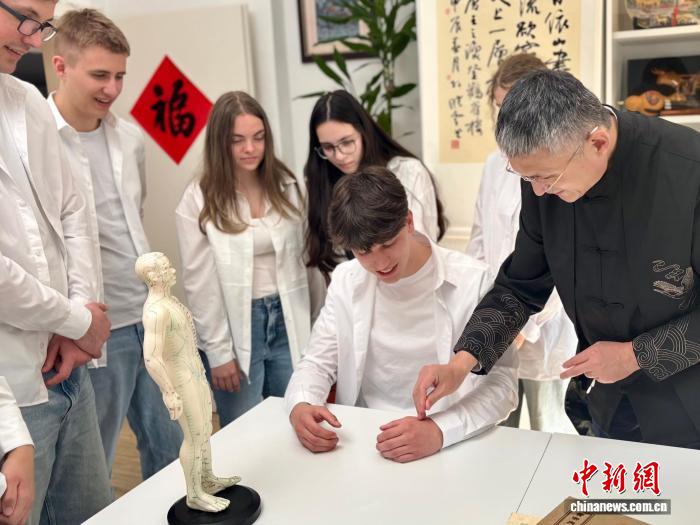 当地时间4月24日,北京中医药大学副校长刘存志教授在伯乐中文合唱团教室为团员展示针灸。张懿 摄