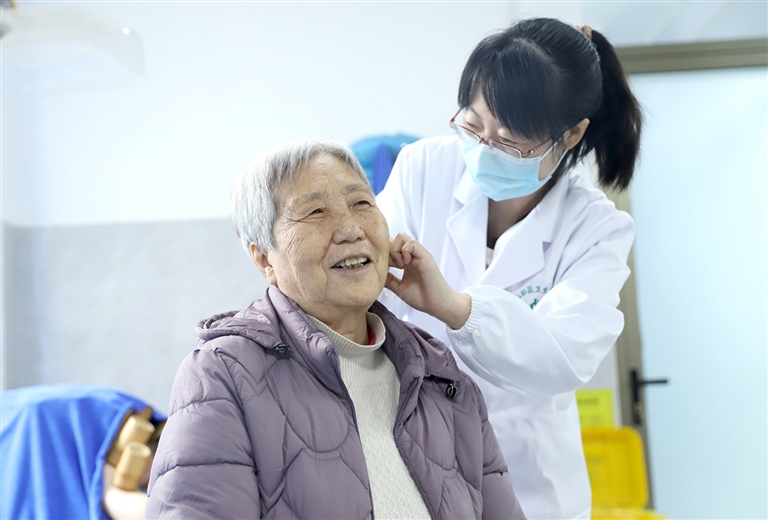 近日正值谷雨节气,山东省邹平市黄山街道社区卫生服务中心中医馆内,医务人员正为辖区居民进行耳穴压豆。