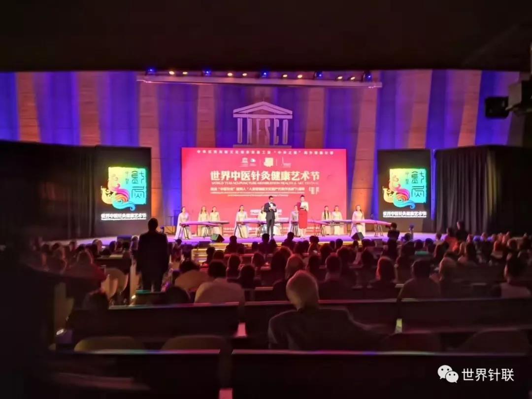 当日晚, 2018世界中医针灸健康艺术节法国站“中医针灸·健康全球”拉开帷幕。中国文化和旅游部非物质文化遗产司司长陈通在致辞中说,这次世界针灸日系列活动是跨越文明的对话,激发人们对文化多样性的尊重、欣赏与相互欣赏;活动也是跨越时代的对话,是我们21世纪人类对古代人民的礼敬、赞美和感恩,感恩他们给我们留下这如此神奇而美妙的身心健康管理方案。由中外演员共同带来的话剧《希波克拉底和黄帝的对话》拉开了艺术节演出的序幕,生动展现了东方与西方最伟大的医学家、哲学家之间的文化对话。随后,由中国东方乐团带来的《针艾千年幻想曲》用音乐引领观众思索中医针灸从源起、发展、兴盛到广为流传的伟大轨迹。《针源·欢庆》引领观众重回中医药针灸诞生的时期,也是中华民族最早的医学著作《黄帝内经》诞生的年代,在一位小演奏家的古筝独奏《针道·黄帝内经颂》中,最初的中医针灸记忆被唤醒,中医古老深邃的天人合一智慧和悬壶济世的伟大决心蕴藏其中。《针流·战台风》与《针盛·千年传承狂想曲》以中国民乐带领观众穿越千年,感受中医针灸在扁鹊、华佗、张仲景等医学家和皇甫谧等针灸名医的努力之下的发展壮大。来自西方的钢琴与来自东方的新筝携手,以协奏曲《针传·中华大成扬四海》共同演绎东方与西方通过医学的传播互鉴,衍生出一段精彩的跨文化交流。艺术节以庆祝中医针灸被列入“人类非物质文化遗产名录”八周年仪式为高潮,嘉宾上台共同见证了这一历史时刻及 “巴黎宣言”的全球公布。整场艺术节在世界中医针灸主题歌曲《针艾世界》中结束,观众报以持续热烈的掌声。