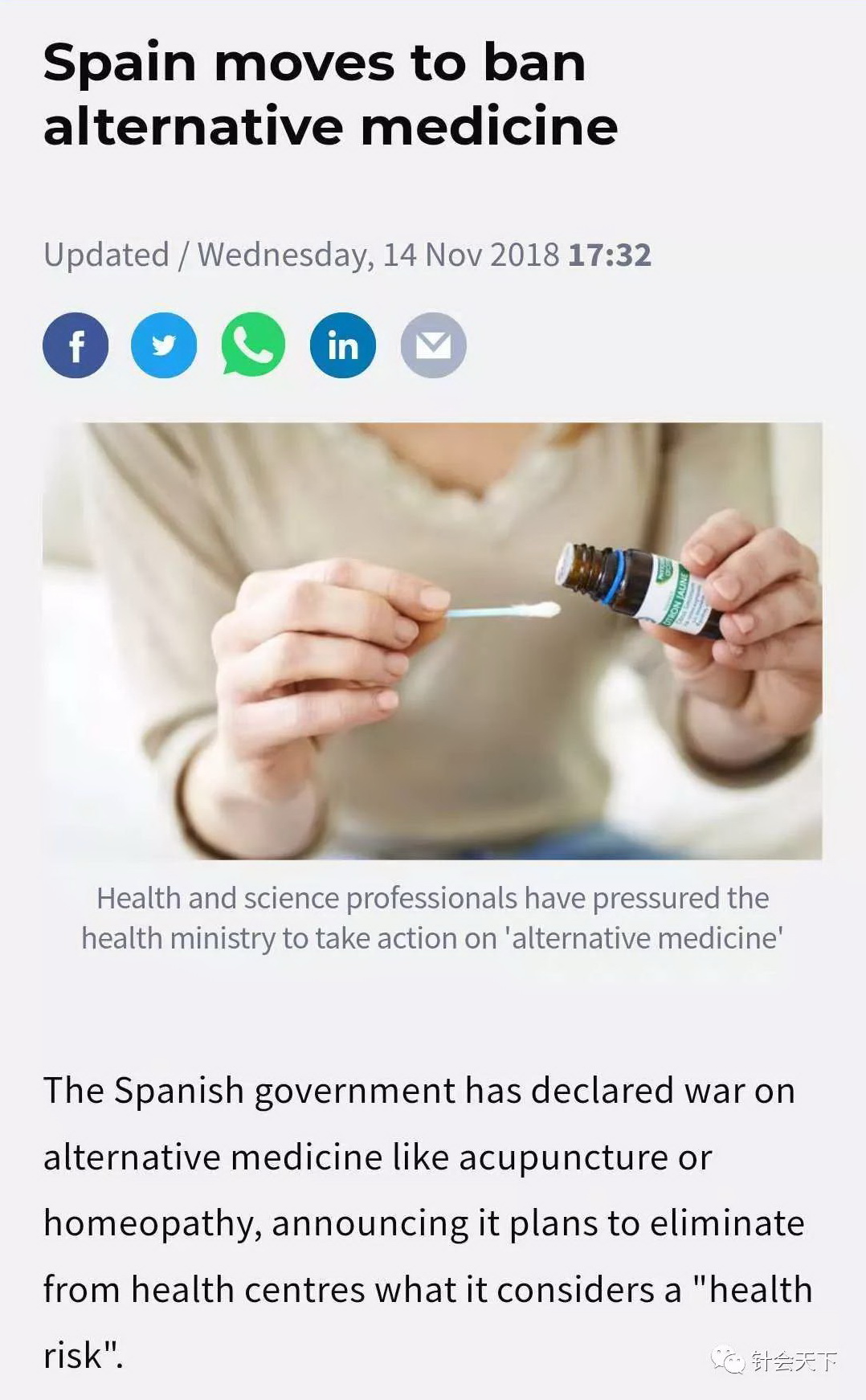 这则消息提示,西班牙政府已经向替代医学宣战,宣布计划从健康中心中清除那些有健康风险的替代疗法。虽然没有说明具体包括哪些替代医学,但是给出了针灸和顺势疗法的例子。