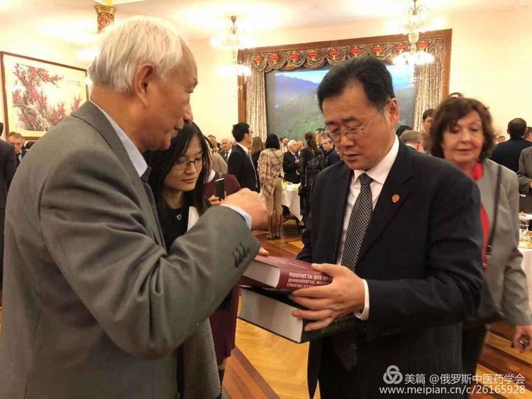 会上俄罗斯中医药学会 名誉会长、俄罗斯医学科学院 名誉院士司怀珠先生向使馆及国家中医药管理局赠送最新出版的中医药书籍,得到中国及俄罗斯各方赞扬!