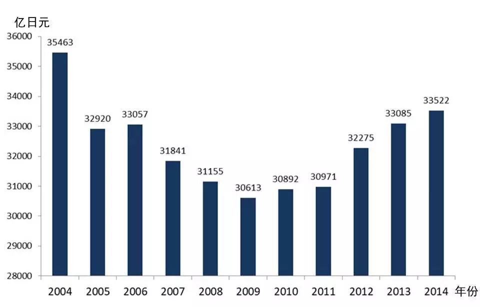 日本是现代保健食品的创始国。日本的健康产品有蜂王浆、大麦胚芽油、鱼油、植物蛋白、维生素类、钙等微量元素类产品。健康食品市场从2004年到2014年呈波动发展趋势,2009年为低谷,为30613亿日元;2014年达到33522亿日元。如图2。