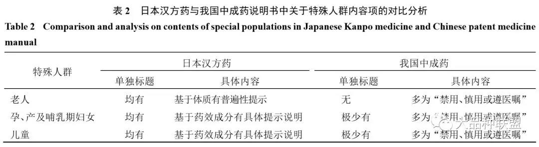 根据原国家食品药品监督管理局2006年印发的《中药、天然药物处方药说明书格式内容书写要求及撰写指导原则的通知》,特殊人群用药中如进行过该项相关研究,应简要说明在妊娠、分娩及哺乳期,该药对母婴的影响,并说明可否应用本品及用药注意事项;如进行过该项相关研究,应说明儿童患者可否应用该药品,可应用者应说明用药注意的事项;如进行过该项相关研究,应对老年患者使用该药品的特殊情况予以说明,包括使用限制、特定监护需要、与老年患者用药相关的危险性,以及其他与用药有关的安全性和有效性的信息。《非处方药说明书规范细则》中关于特殊人群用药中,对于可用于儿童的药品必须注明“儿童必须在成人监护下使用”;对于是否适用于孕妇、哺乳期妇女、儿童、老人等特殊人群尚不明确的,必须注明“应在医师指导下使用”。汉方药与中成药说明书中关于特殊人群内容项的对比分析见表2。