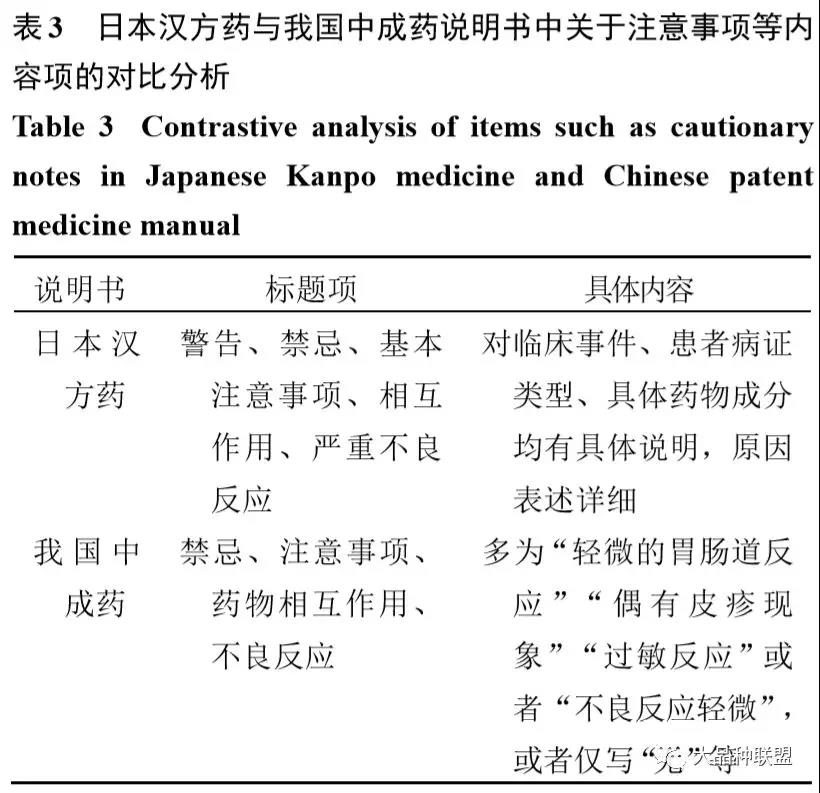 同样,在源于小青龙汤的中成药小青龙颗粒说明书中【药物相互作用】项中仅有“如与其他药物同时使用可能会发生药物相互作用,详情请咨询医师或药师。”的说明,对比汉方药说明书内容,更是缺乏具体信息。日本汉方药与我国中成药说明书中关于注意事项等内容项的对比分析见表3。