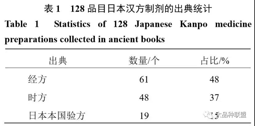 根据对128品目日本汉方制剂出典的统计分析(表1),出典我国经典名方共计109个,占比85%;出典日本本国验方19个,占比15%。其中,61个名方出于《伤寒论》和《金匮要略》,占出典我国经典名方总数的56%。由此可以看出,在日本汉方制剂的应用中,经方占有绝对的优势。