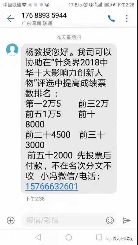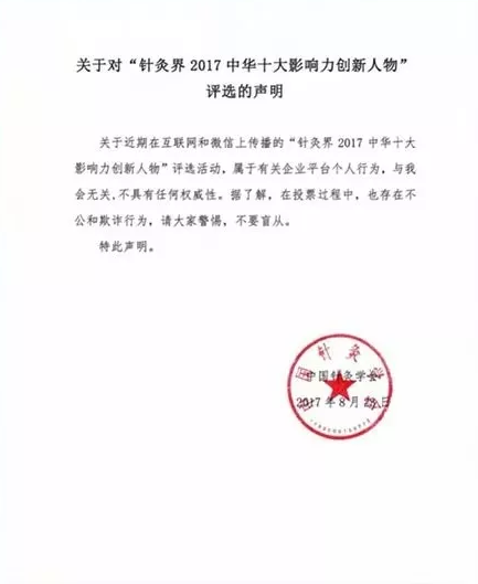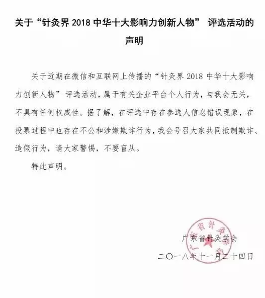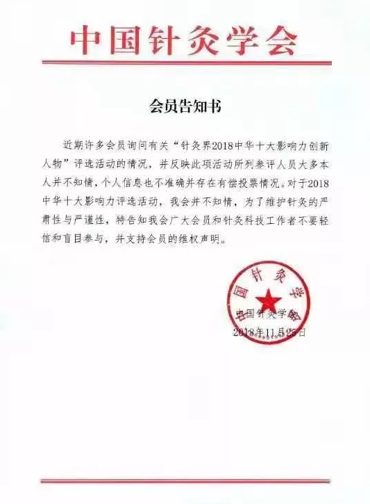近几年来,有家名为“两全其美”的企业,以“针灸界”和“针灸界杂志”、“针灸界编辑部”、“针灸界秘书处”的名义,搞所谓“新针灸运动”,说什么“不吃祖宗饭”(就是应该针灸界抛弃中医几千年的学术与临床成果积累)、通过微信和网络以100-200元价格售卖所谓“新针灸运动”“荣誉证书”电子图片;还从2017年就开始大搞主要通过微信“投票”的“针灸界中华十大创新影响力人物奖”评选。2017年,该活动就因其投票活动存在有偿拉票卖票等行为,中国针灸学会就曾经发表声明,指出该活动“不具有权威性”,“存在不公和欺诈”,也遭到一些同道甚至“提名者”的抵制;2018年,他们仍然举行的该活动,又被同道举报存在类似行为,中国针灸学会和广东省针灸学会先后向其会员先后发出通知,再次提醒该活动存在“个人信息不准确”、“参与者不知情”、“存在有偿投票”等问题,鼓励其会员和针灸工作者不要参与。但是这个活动,仍然通过微信等网络平台进行宣传,将继续于12月21-23日举行。