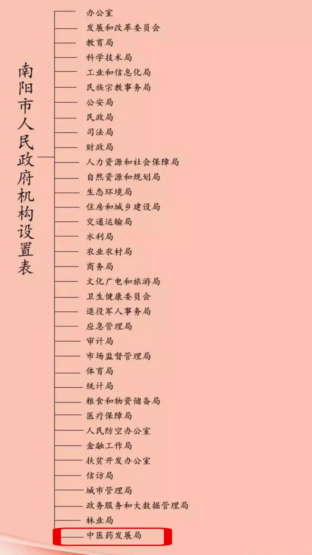 南阳市中医药发展局是南阳市在新一轮机构改革中因地制宜新设立的3个机构之一,是为了推动中医药发展、建设中医药强市而设置的。按照改革进度安排,2019年1月底前南阳市中医药发展局将正式挂牌,并完成人员转隶及职能划转等工作,2月底前印发“三定”方案。(崔松涛 魏淯滨)