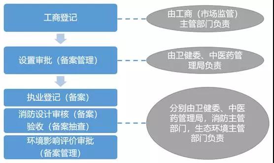 第一步,卫生健康、中医药主管部门根据行业准入管理相关规定,对医疗机构进行设置审批(备案管理)。按规定实行设置审批与执业登记“两证合一”的医疗机构,卫生健康、中医药主管部门在执业登记前提供准入政策咨询。
