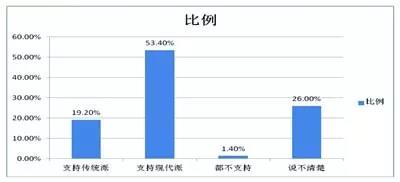 随着时代的发展,中医界内部也不断分化,有标榜纯中医的,有追求中西医结合的,有中医“一张皮”的,有扮演中医掘墓人角色的,最主要的分为两类,即传统派和现代派。大部分人支持现代派,占比为53.4%,有差不多两成的人支持传统派。说明人们还是希望中医医生能够汇通中西,同时运用两种医学体系的诊治本领,更好的为患者服务。(见图14)