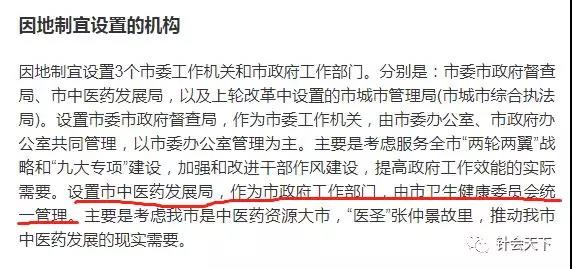 上图划红线的文字显示:“设置市中医药发展局,作为市政府工作部门,由市卫生健康委员会统一管理。”