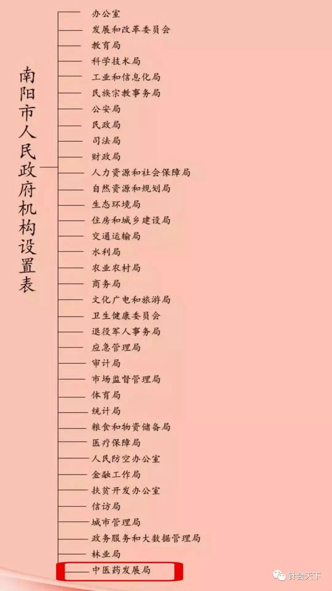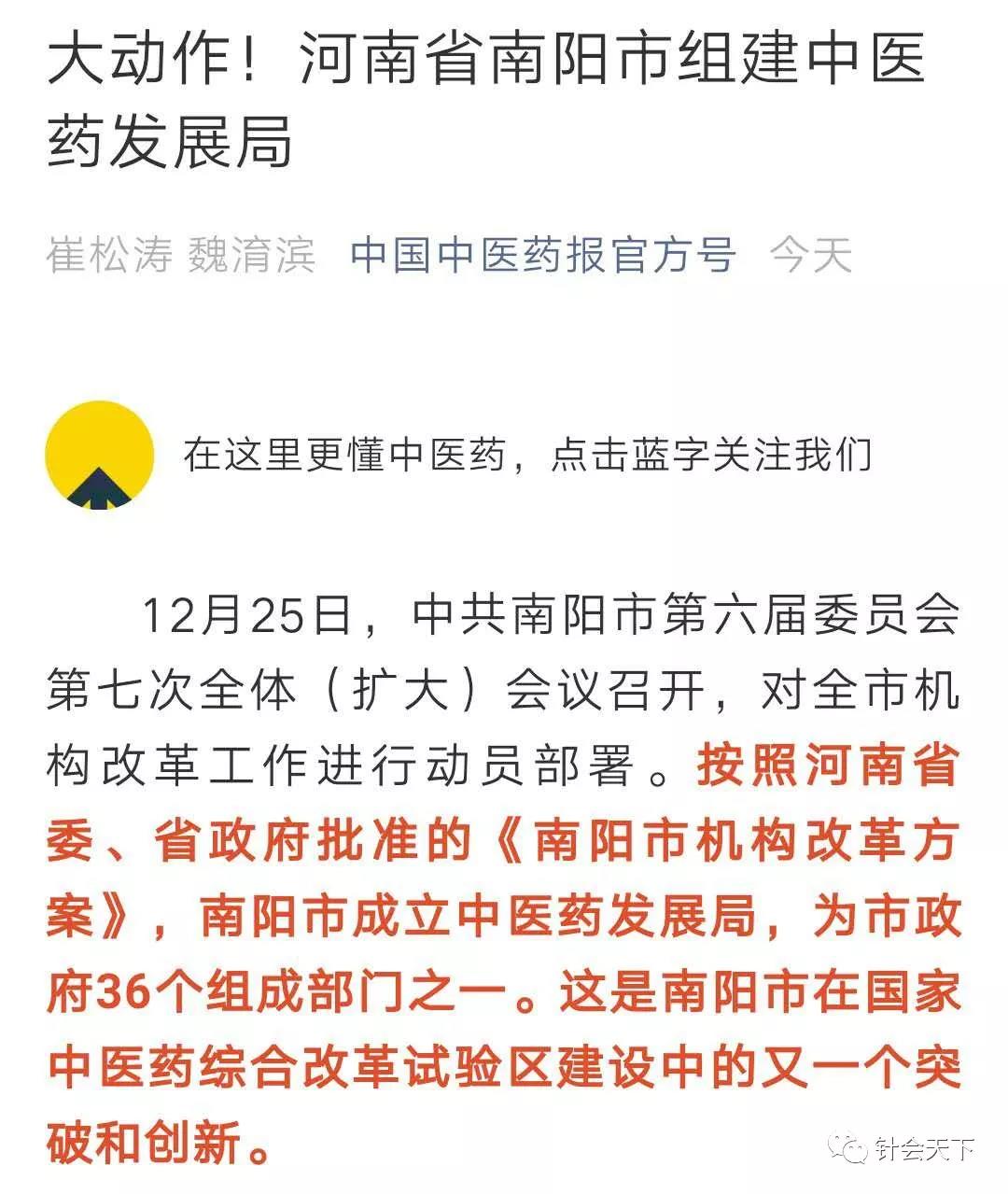 接下来文章说:“南阳市2016年12月被列为国家中医药综合改革试验区。南阳历届市委、市政府高度重视中医药发展,中医药整体工作水平名列全省、全国前列。2012年,南阳市在全国率先成立正处级规格的中医药管理局,13个行政编制,7个事业编制,一正两副,内设4个职能科室。全市12个县区中,全部成立了中医药管理局或中医药发展办,实现了编制、经费、业务独立,理顺了市、县中医药管理体制,全市中医药管理机构建设居全国之首。”