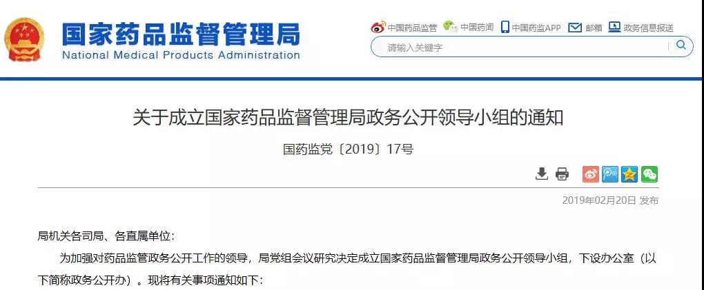 国家药品监督管理局政务公开领导小组设组长2名,副组长3名,国家药监局各司局、各直属单位主要负责同志为小组成员。