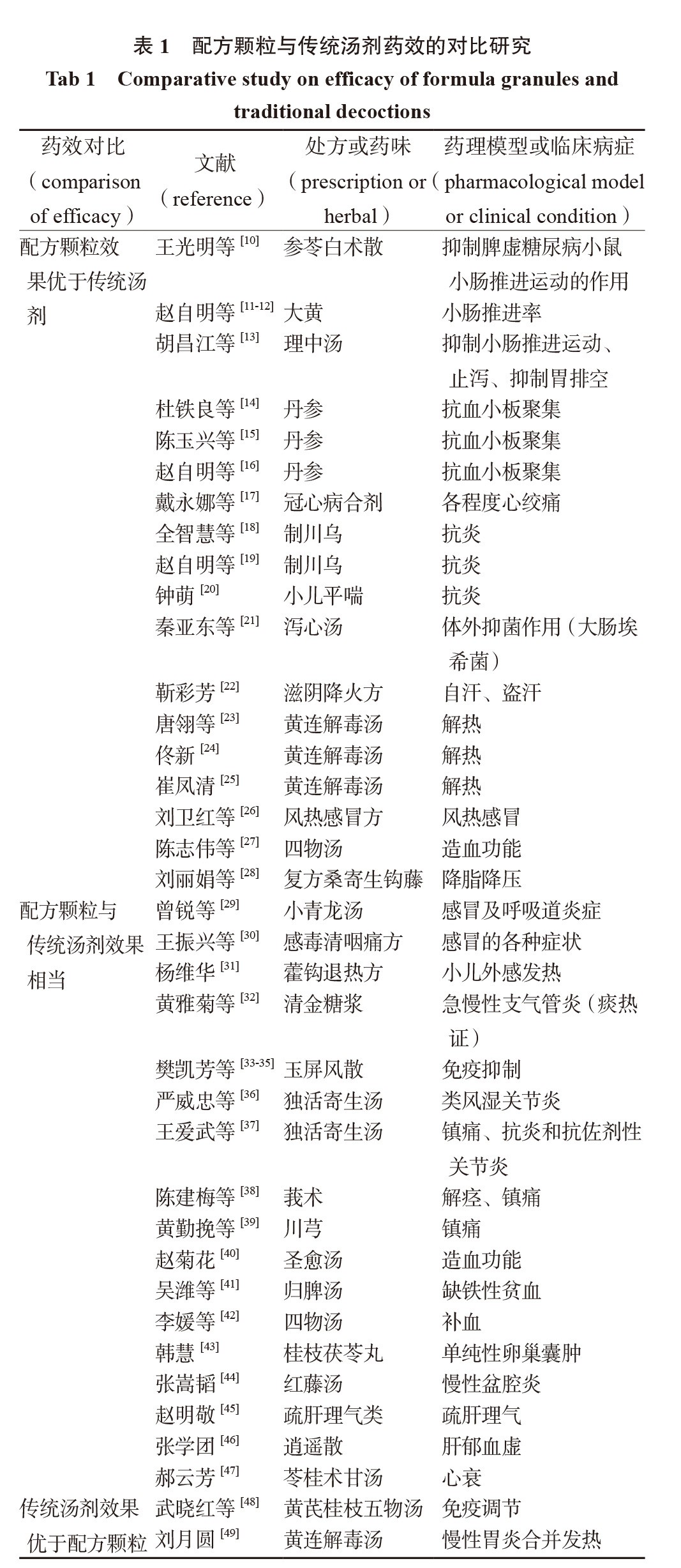 临床疗效是最终判断中药配方颗粒是否有效的标准。中药汤剂经过几千年的临床应用,已无数次地证明其有确切的疗效。中药配方颗粒正式开始临床应用虽然还不久,但从近年来的文献报道来看,两者在临床使用时接近等效。从实验动物药效学的文献报道来看,配方颗粒与传统汤剂药效对比有3种结果:①配方颗粒效果优于传统汤剂;②配方颗粒与传统汤剂效果相当;③传统汤剂效果优于配方颗粒(见表1)。