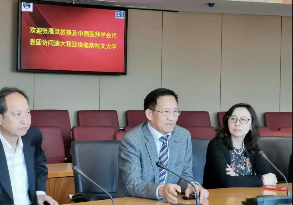 伊迪斯·科文大学副校长王嵬教授欢迎中国医师学会、世界华人医师协会代表团到访并向代表团介绍了多年以来,ECU和中国各类院校与机构开展的不同层次的合作,其中包括伊迪斯·科文大学与哈尔滨医科大学等重点医科大学的博士联合培养项目、本科联合办学项目、学者访问和年轻教师进修项目。