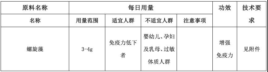 通过查阅已批准的产品信息,螺旋藻产品可以声称的功能包括增强免疫力、调节血脂、抗辐射等,其中单方螺旋藻产品声称增强免疫力功能的产品数量最多,占总数的93.94%。此外文献报道信息和国外螺旋藻产品的功能声称汇总分析,均认为螺旋藻具有增强免疫力的保健功能,因此将增强免疫力作为《原料目录信息表》中螺旋藻粉的功效。