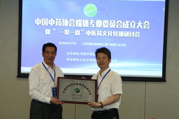 中国中药协会刘张林副会长(左)为媒体专业委员会授牌