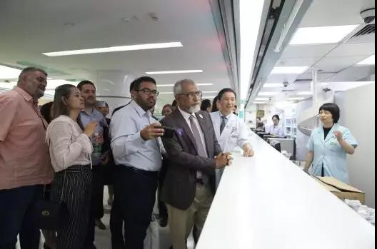 在医院检验医学部,参观团成员在了解到省中医院检验医学部是中国第二家通过国际标准认可ISO 15189的医院检验科,检验结果可得到全球70多个国家和经济体的互认;建立中国医院首批医学参考实验室,并于2013年1月通过了ISO 15195和ISO/IEC17025双标准的参考实验室认可,并有11个项目进入了国际检验医学量值溯源联合委员会(JCTLM)服务列表的时候,表示赞叹!