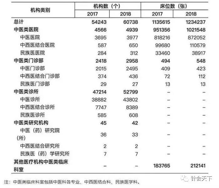 床位方面,至2018年末,全国中医类医疗机构床位123.4万张,其中中医类医院102.2万张,占82.8%。与2017年相比,中医类床位增加9.9万张,其中中医类医院床位增加7.0万张。