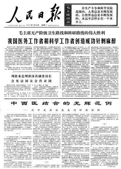 1972年2月,在尼克松访华期间,代表团成员黑格准将率领美国官员和媒体记者三十余人参观了针麻下肺切除手术,表示出惊讶和赞叹。这样针刺麻醉走出了国门,震动了世界医学界。