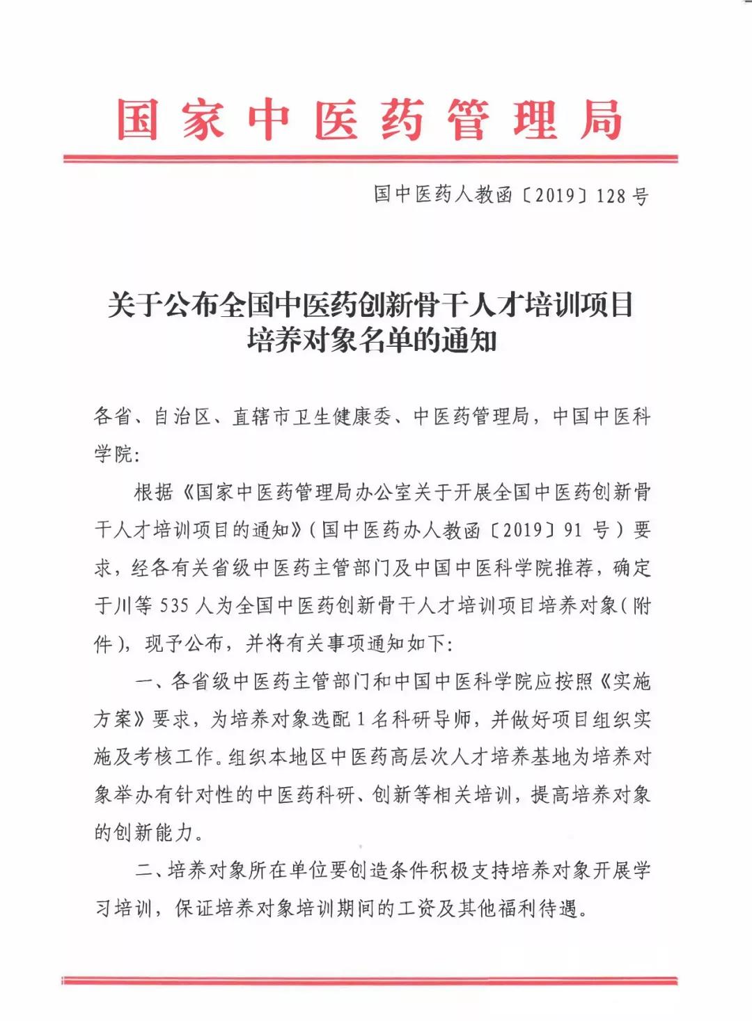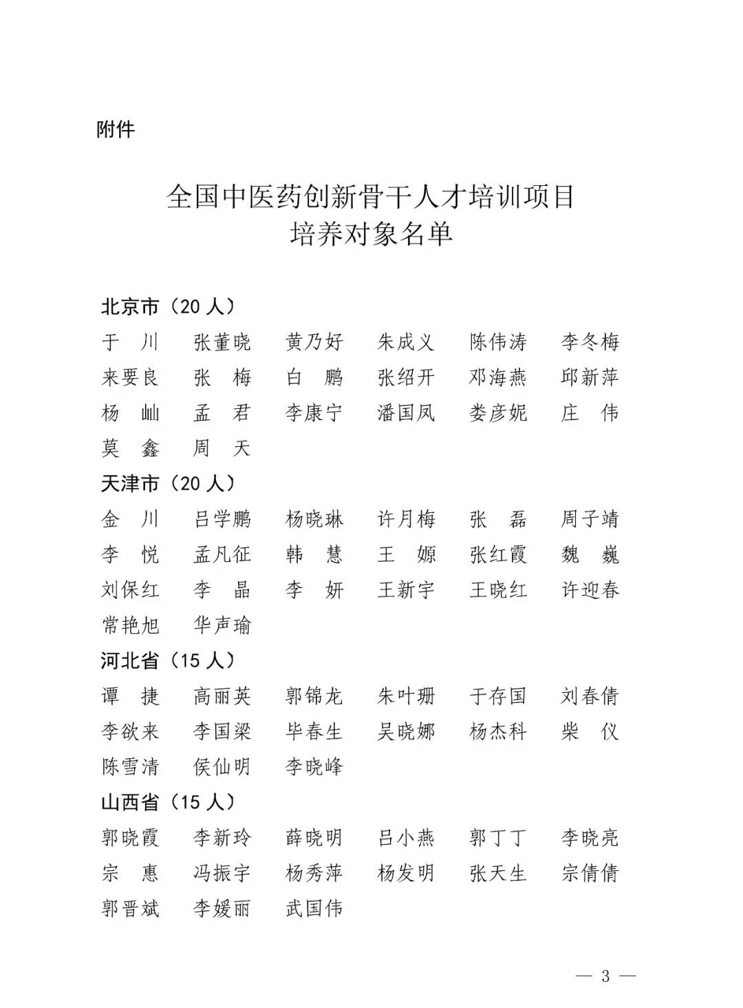 关于公布全国中医药创新骨干人才培训项目培养对象名单的通知