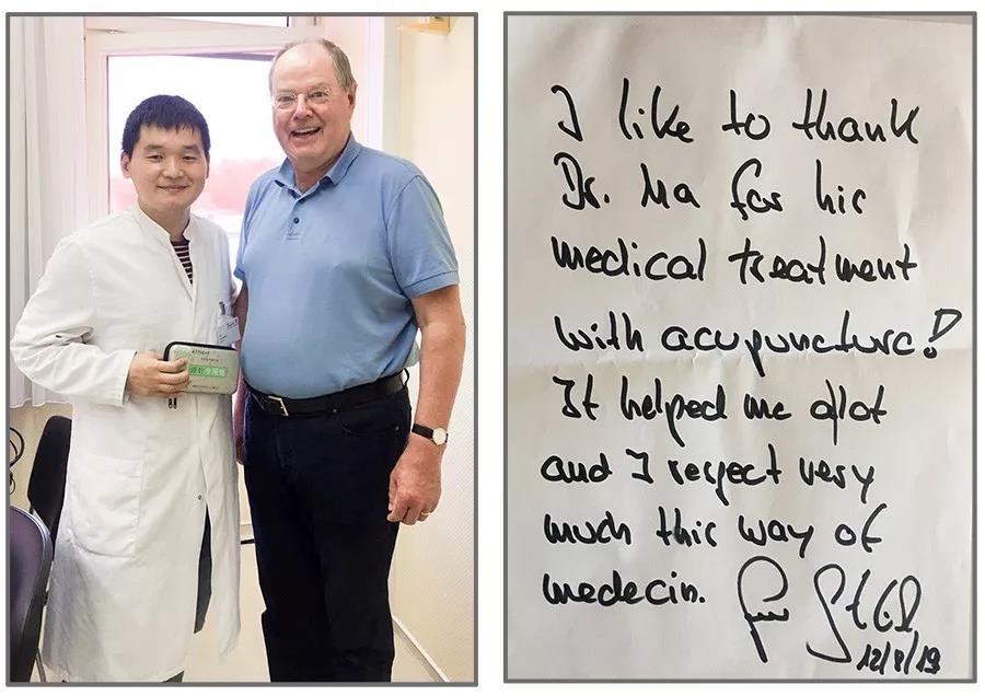 书信作者是德国前财政部部长佩尔·施泰因布吕克(Peer Steinbrück)先生。一年前,他出现左髋部疼痛、活动受限,伴有轻度跛行,下肢内外旋转时,疼痛加剧,曾到各地医治,效果不佳。今年8月5日,患者到Johanniter GmbH Waldkrankenhaus(波恩大学教学医院)就诊,医院院长兼骨科、创伤外科主任Christian Paul教授接诊患者后,通过分析影像学资料及临床查体,排除腰椎、骨盆及髋关节病变引起的疼痛,但原因不明,没有特别处理方法。由于之前交流得知在该院交流学习的重庆医科大学附属永川医院骨科医生马坤龙可以通过中国针灸技术治疗各种疑难痛症,遂通知正在参与手术的马坤龙医生“紧急会诊”。